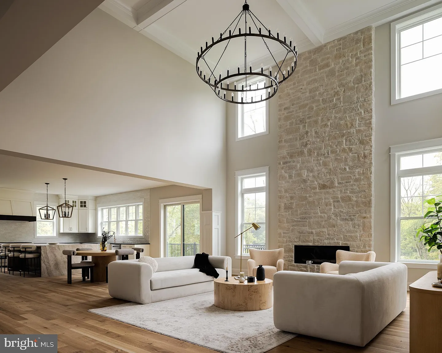 A covered wrap-around porch dresses the front entranceway, with wide-plank, light hardwood flooring greeting you upon arrival. As you step into the great room, allow your gaze to climb upwards, and prepare to be left impressed by the strikingly high ceilings and exquisite floor-to-ceiling marble gas fireplace. The open concept floor plan gracefully transitions into the gourmet kitchen, fitted with an additional chef’s workspace, quartz countertops, Jennair stainless-steel appliances, a dual seating center island and sliding glass doors that lead to a bi-level walkout deck- an ideal setup for summer parties and outdoor entertaining.